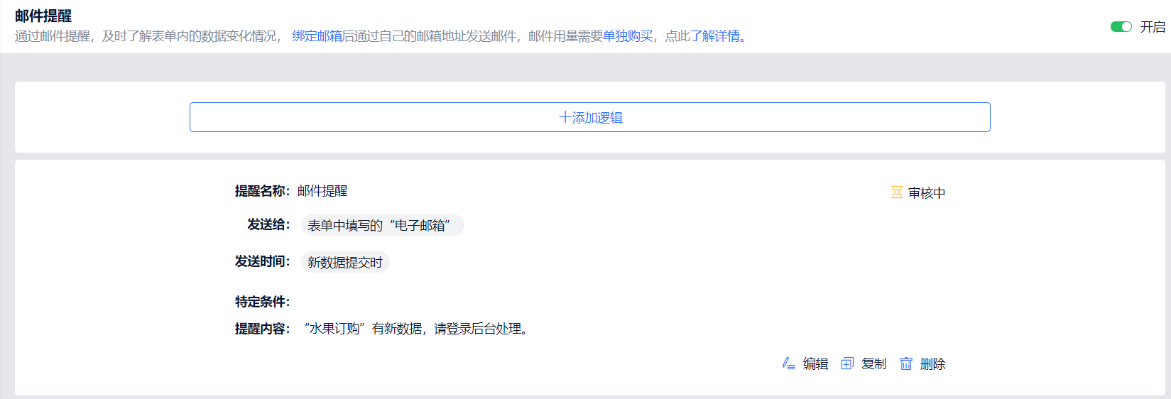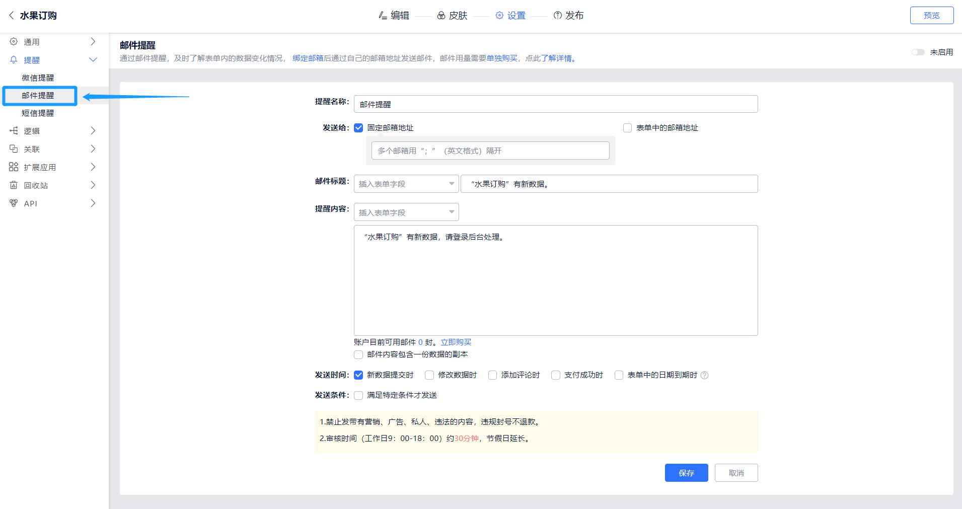 - 在表单设置页面创建邮件提醒后,点击保存提交后后即进入审核后台。一经进入审核状态(审核中、已通过或未通过),邮件提醒设置不可再次编辑修改。审核通过后可进行发送;审核中或未通过,则无法进行修改、发送操作,仅能删除。