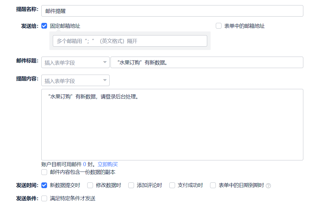 提醒名称:提醒名称用于设置多个邮件提醒时标记识别,下发时不会显示提醒名称,仅在表单设置页面显示。