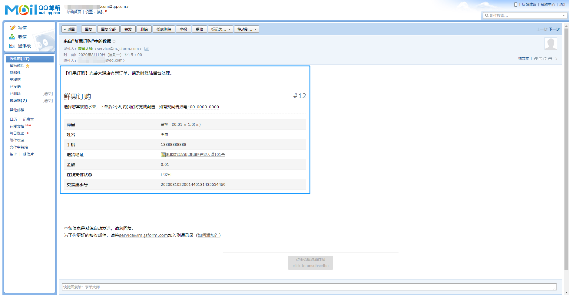 选择发送固定内容,填写邮箱地址,支持添加多个邮箱地址,在中间的空白框内输入邮件内容,点击发送邮件即可。收到的邮件中就会看到邮件内容以及表单中的数据信息。