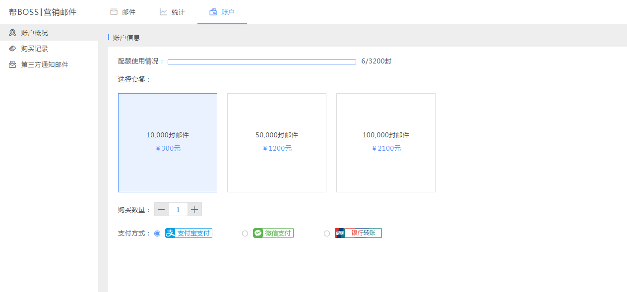 邮件功能同短信功能一致,发送邮件也需要消耗邮件配额数量,每发送一封邮件,系统相应也会扣除一条配额。表单大师目前有三种邮件的资费套餐,可以根据需求付费购买邮件配额,邮件套餐购买入口:营销邮件>>账户>>账户概况。