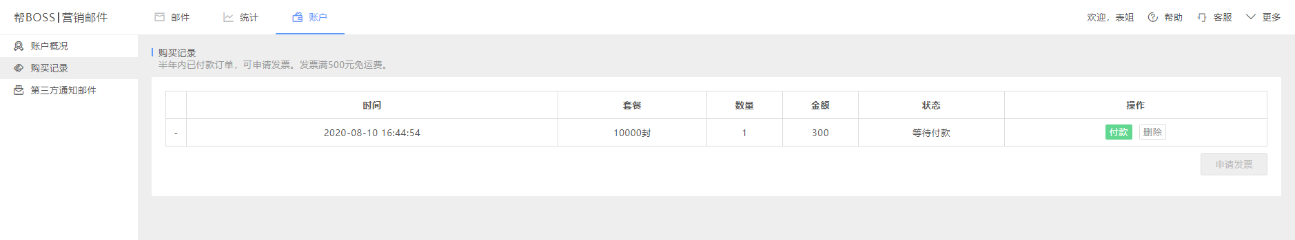 邮件购买记录包括购买时间、套餐、数量、金额、支付状态等信息,未付款的订单信息也会在此处显示,可进行付款或删除订单这两项操作。