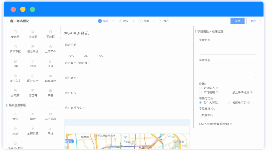 表单大师提供了地理位置字段,利用手机的GPS功能,可以轻松实现填表人的自动定位。广泛应用于户外设备巡检、户外考勤和户外签到等场景。和定位相关的功能都需要用到地理位置字段。