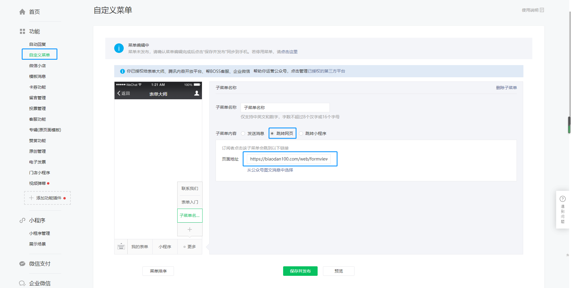 通过公众号的自定义菜单挂载表单小程序(以服务号为例)