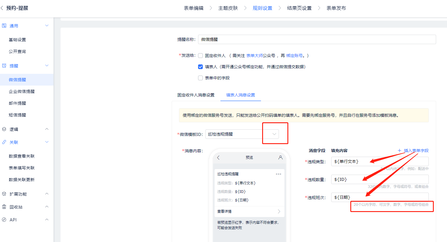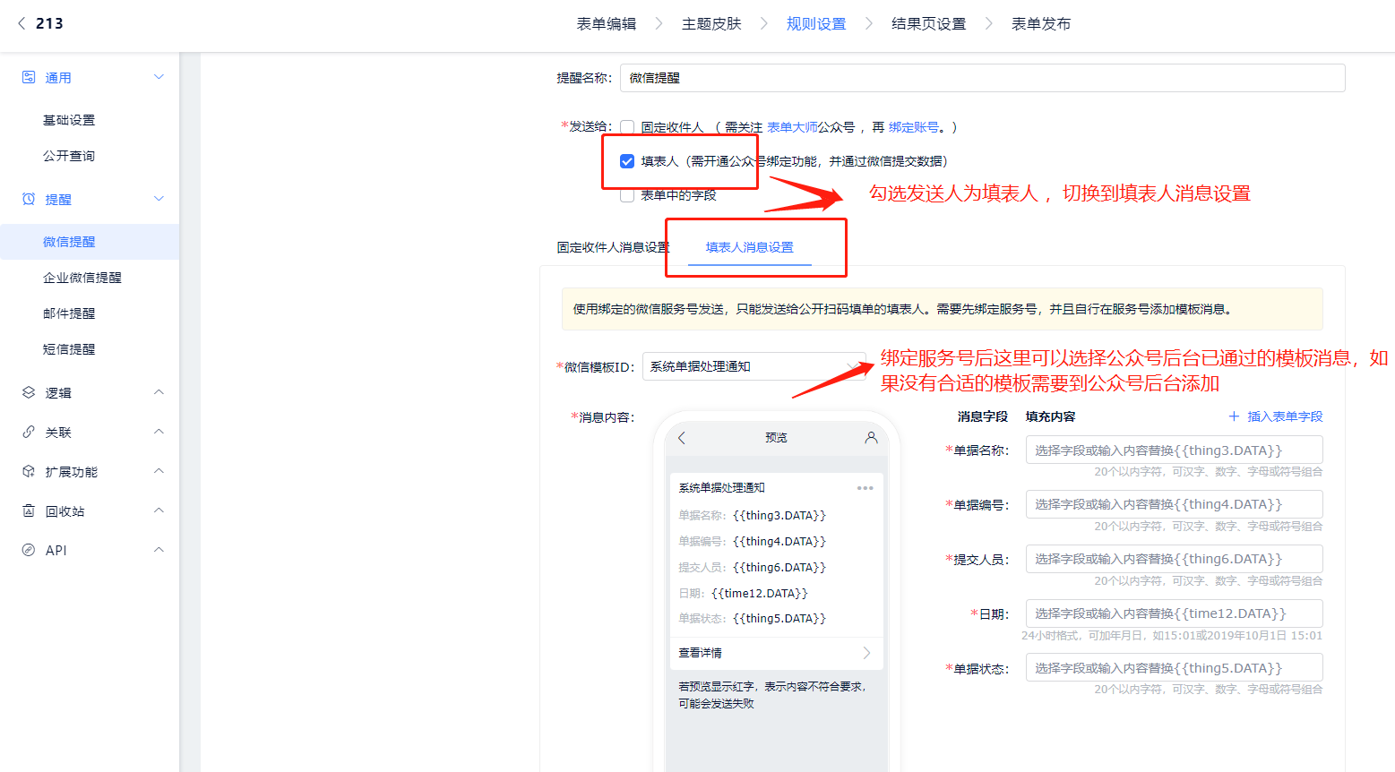 - 第二步:进入表单的微信提醒设置中,新增微信提醒后,发送人需要勾选填表人;切换到填表人消息设置中,微信模板ID会出现客户公众号可用的的消息模板,如果没有合适的模板,则需客户在公众号后台添加,并等待审核通过。