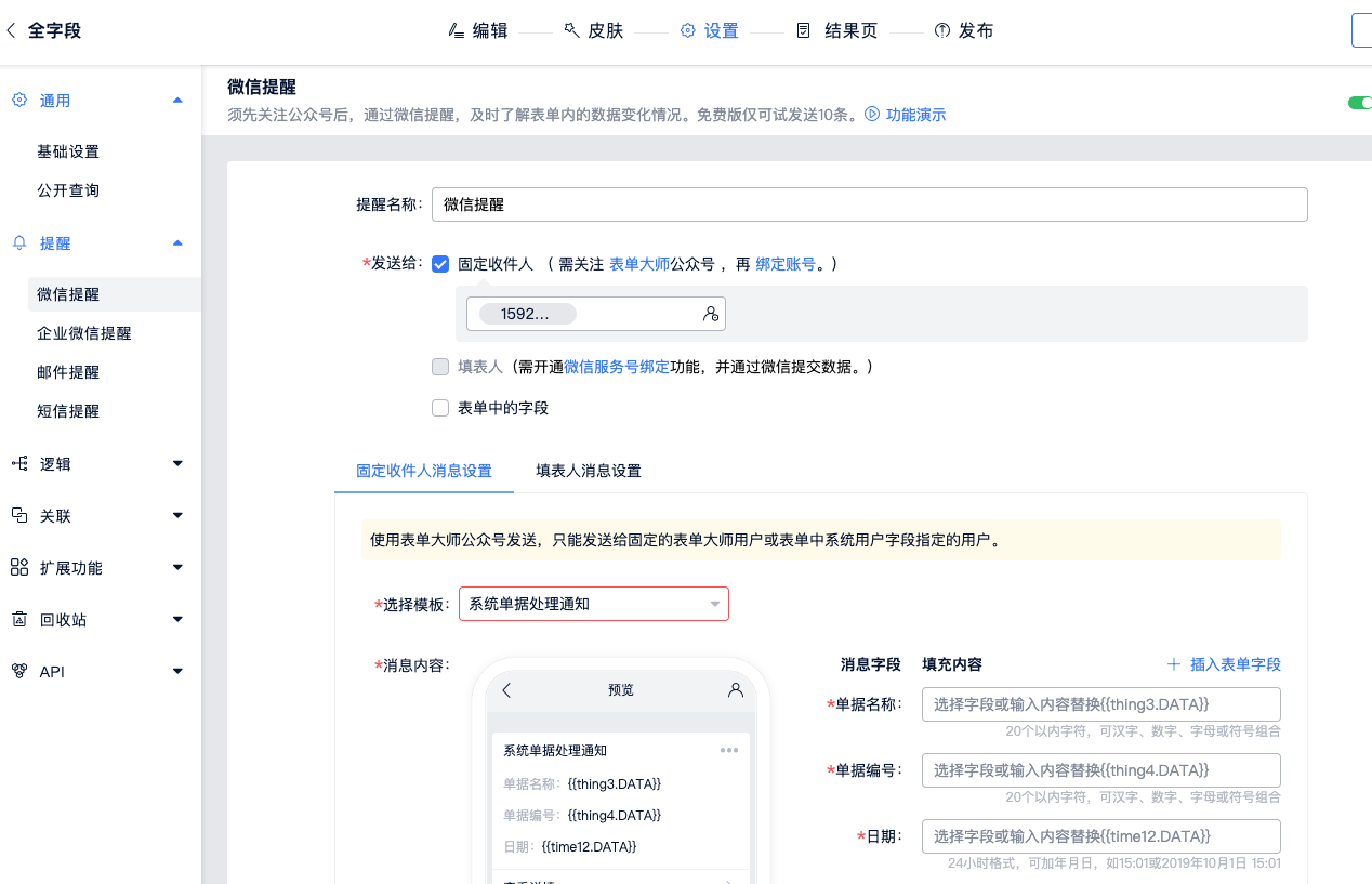 点击表单名称下方的“设置”,在“提醒”中设置微信提醒,按照需要勾选“发送给固定收人”,设置固定收件人消息。如下图所示: