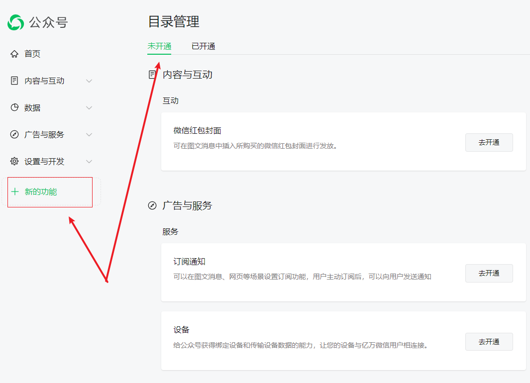 - 第三步:如何添加新的微信消息模板 ?客户登录公众平台,在公众平台上的“添加功能插件”添加“模板消息”这个插件,具体开通方法为,在公众平台后台点击“添加功能插件”,在未开通列表下找到广告与服务下的“模版消息”,点击“去开通”,开通后,可在“已开通”目录下查找到。