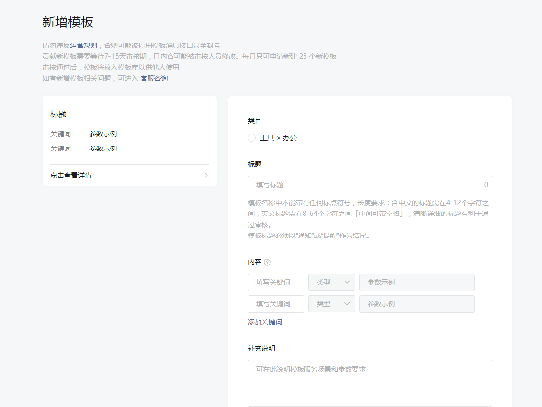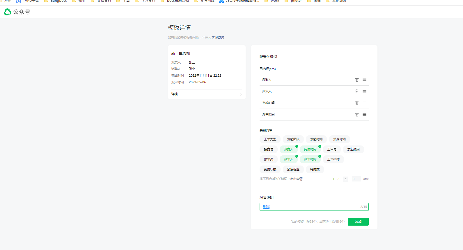 选择一个合适的模板,点击详情,进入模板详情页面,勾选出关键词,并在场景说明中描述出场景,点击添加按钮,这样一个模板就添加成功了。