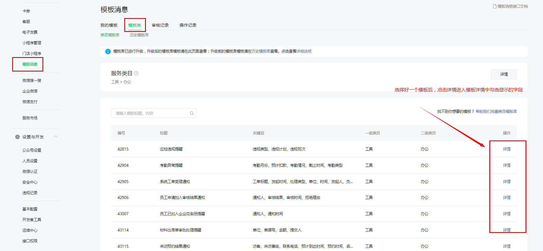 添加了“模板消息”这个插件后,选择“模板消息”,如下图所示会展示此服务类目的模板库。不同的类目对应不同的模板。