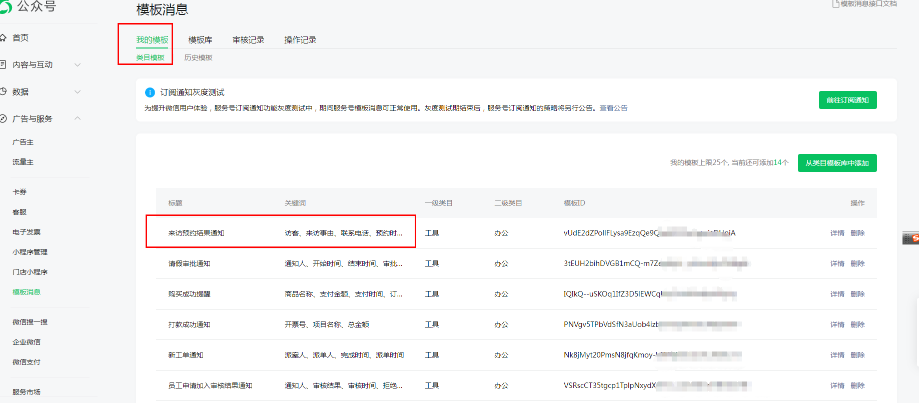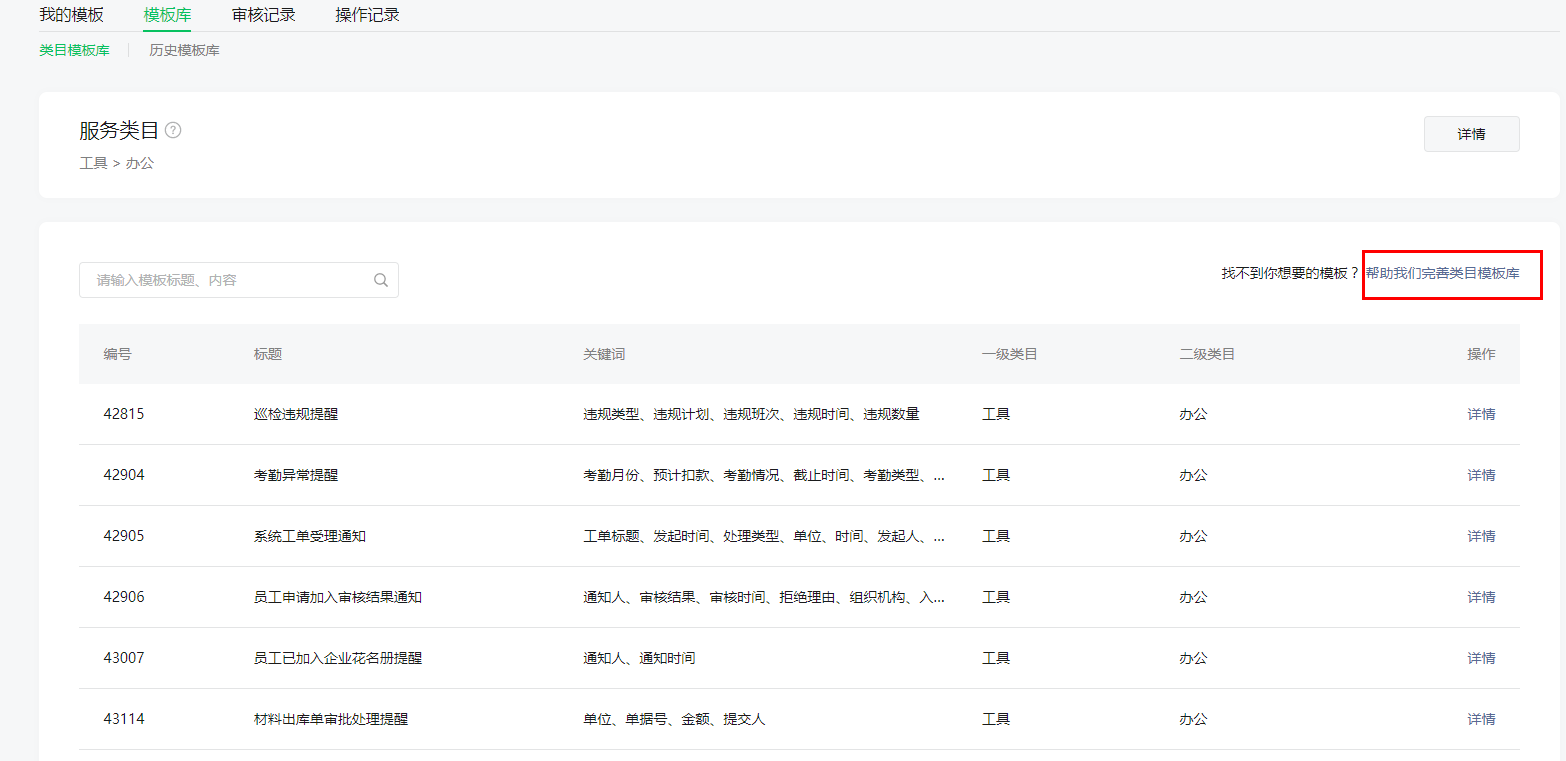 添加模板成功后,可以在模板消息-我的模板-类目模板中查找到。