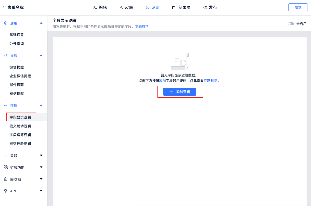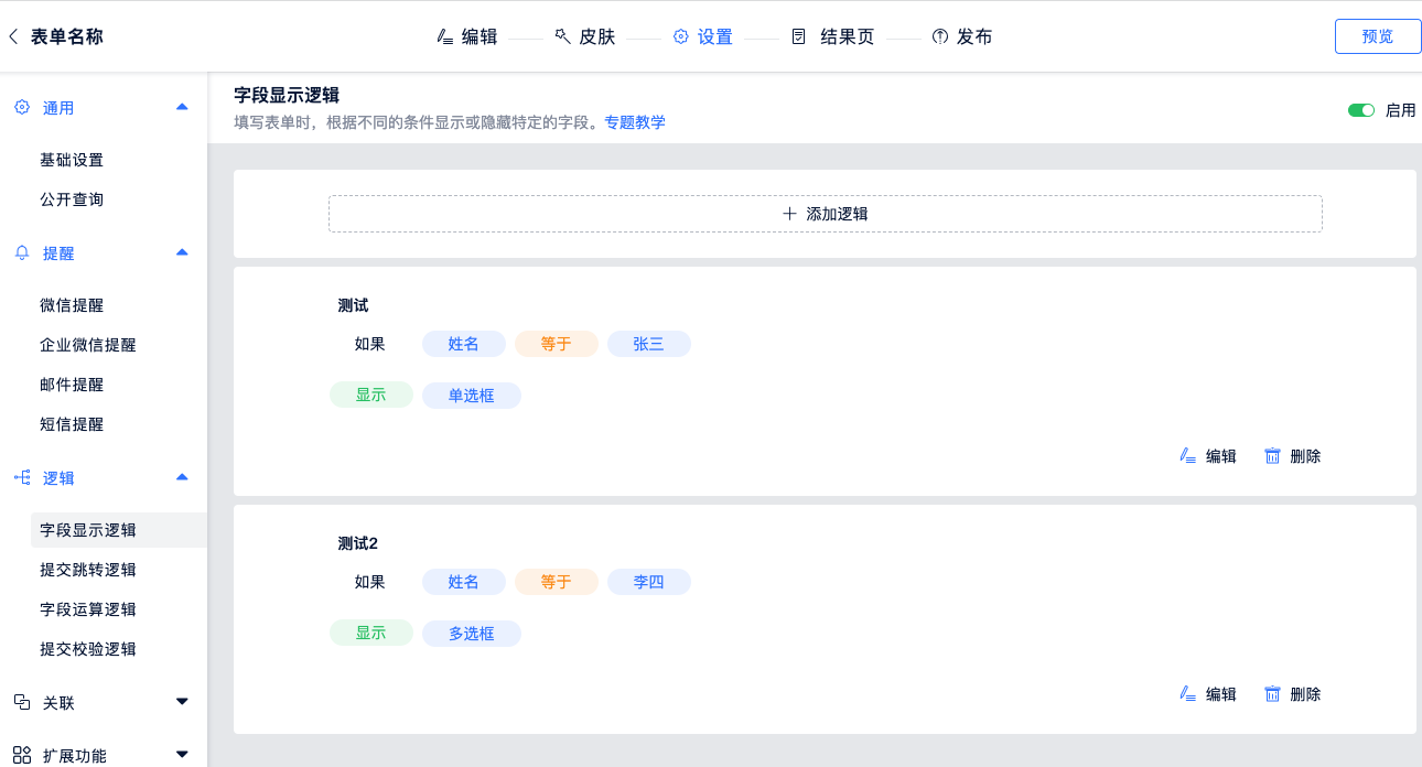 进入”表单设置页”,在页面左侧”逻辑”选项中选择”字段显示逻辑”,点击”立即设置”就可以开始设置字段显示逻辑了,设置前提是表单内必须有多个字段。