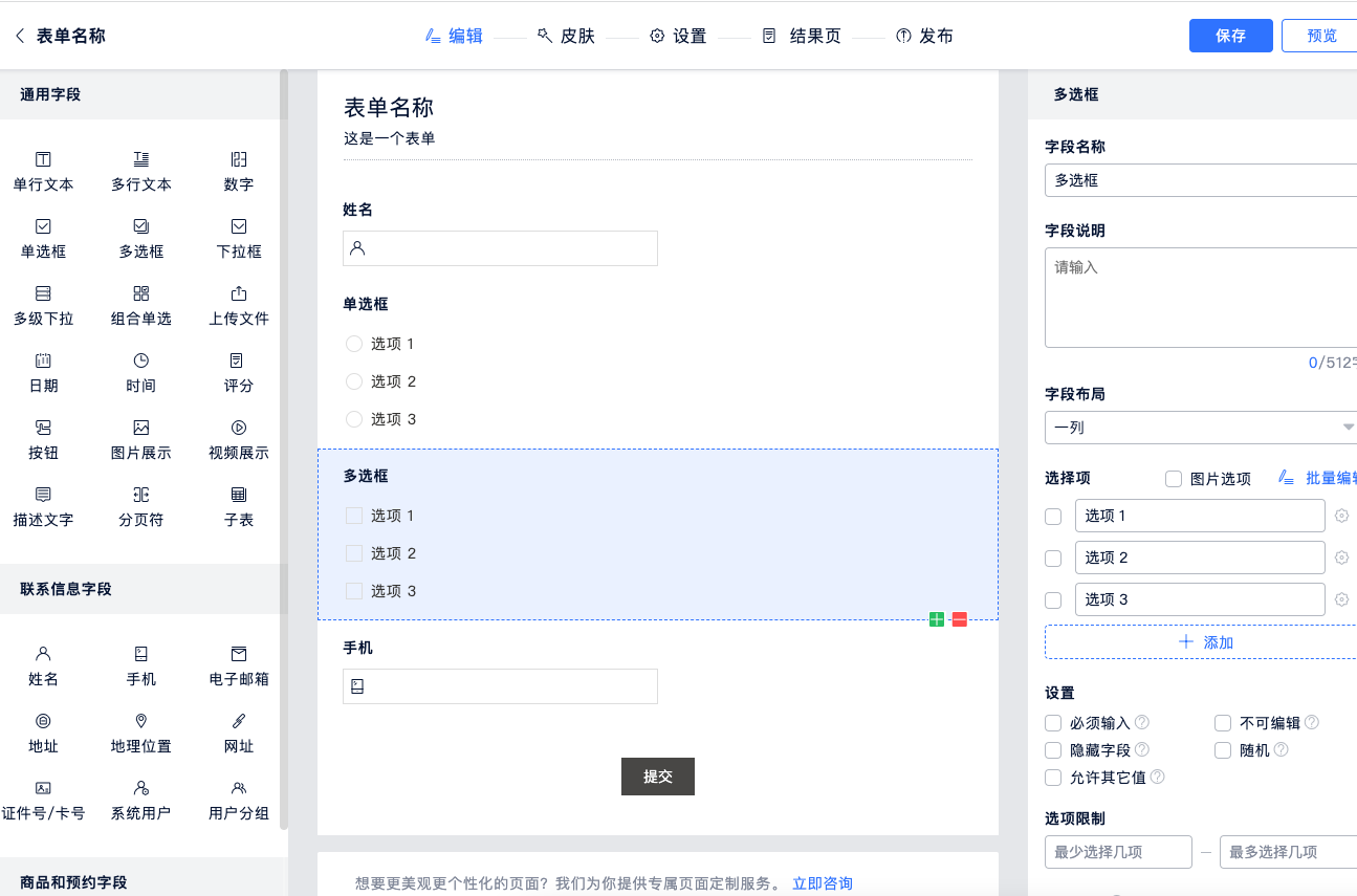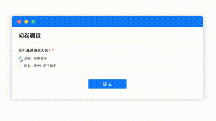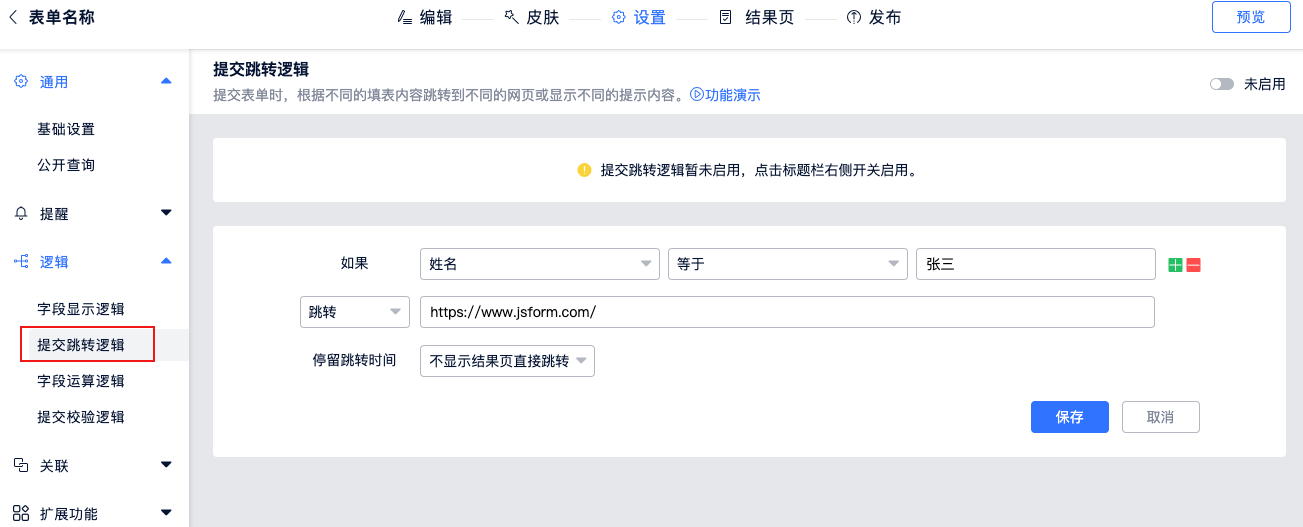 1、如果不需要根据填表内容跳转到不同的页面,只是需要进行统一的页面跳转或结果提示,可以直接使用 “表单->结果页->页面设置”(演示)中的提交跳转进行设置。