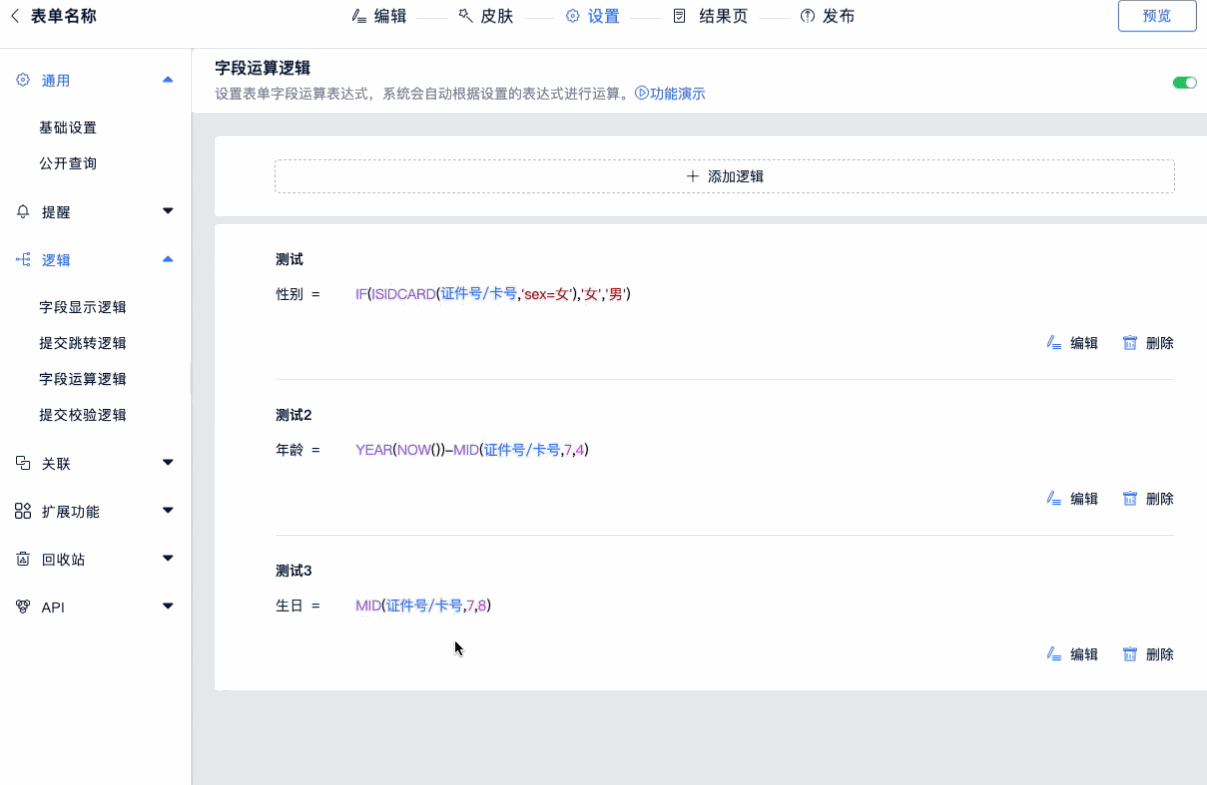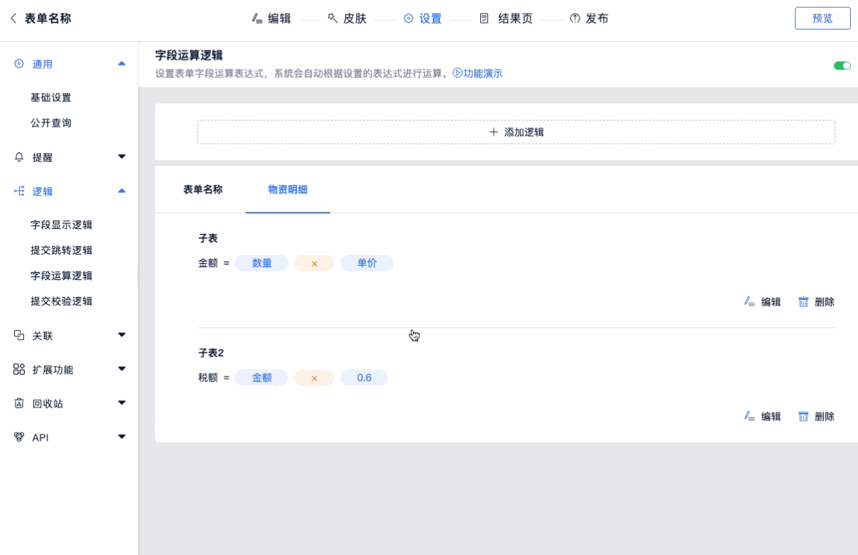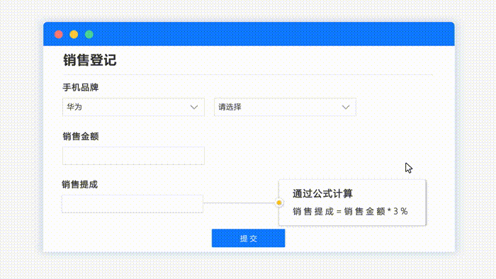 就像Excel中的公式一样,表单大师的字段运算逻辑功能也支持公式和函数。设置表单中字段与字段间的运算公式,系统会自动根据设置的公式进行运算,一个字段的值可以由其它字段计算得出。目前支持普通模式和函数模式。