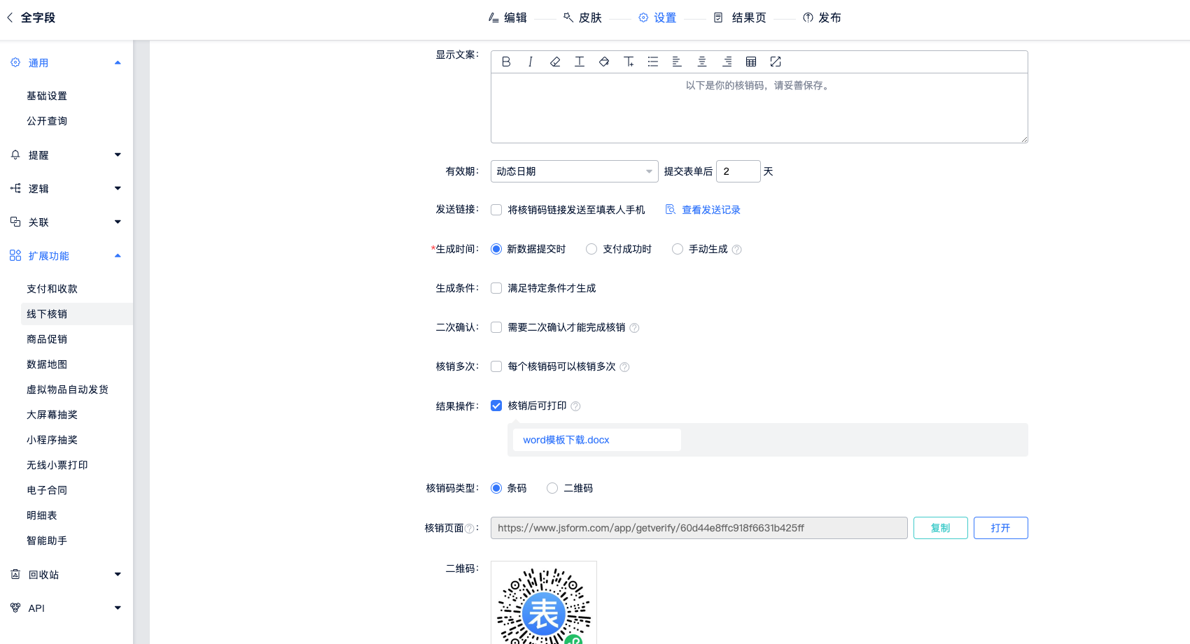 表单设置页面>扩展应用>线下核销,开启“线下核销”即可开始自定义设置核销页面。