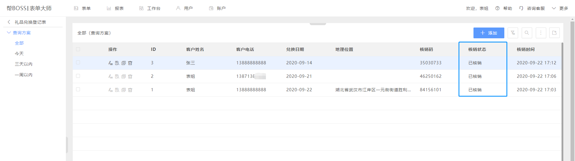 在表单数据页面,选择“显示表单字段”勾选“核销状态”,就能看到每条数据的核销状态,还可以根据核销状态进行数据过滤筛选,方便掌握整体核销情况,也可以根据核销状态导出自己需要的数据。