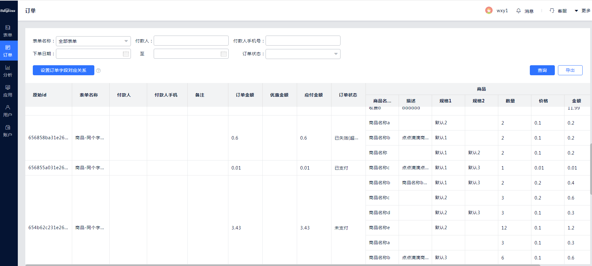 需要设置表单中字段与订单付款人、付款人手机、备注字段的对应关系,新的订单才能正常显示这几个字段,历史订单不受影响。