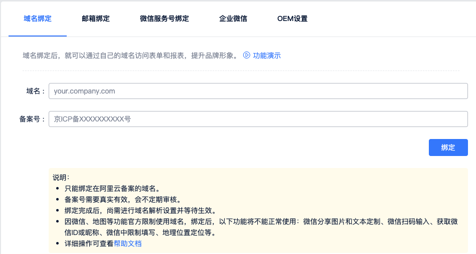 在账户管理页选择“绑定域名”,输入域名,如”form.yourexample.com”,以及您域名的备案号,如”京ICP备xxxxxxxx号”,点击“绑定”。