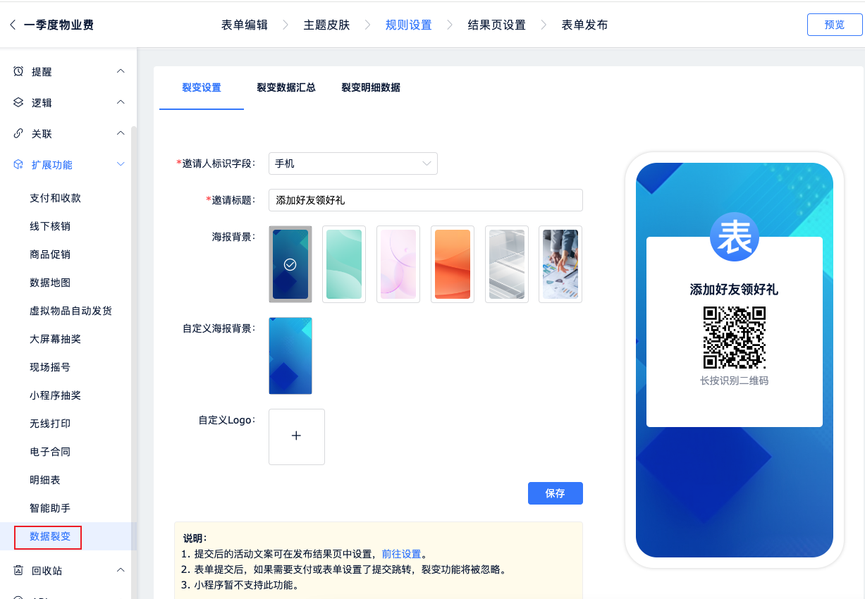如果将表单用于营销获客场景,可以开启数据裂变功能,配合一定的激励机制,让填表人帮你分享和传播,实现指数级的传播效果。