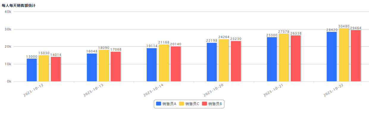 图中的日期在报表设置中就叫作多维度报表显示效果,以柱状图为例(按人统计统计每天的销售总金额):