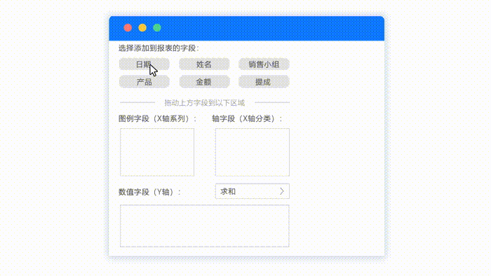 以上面多维度报表显示的效果为例,对应设置如下: 图例字段(X轴系列)设置为“成单人“,轴字段设置为“订单日期”,数值字段(Y轴)设置为 “金额”求和。