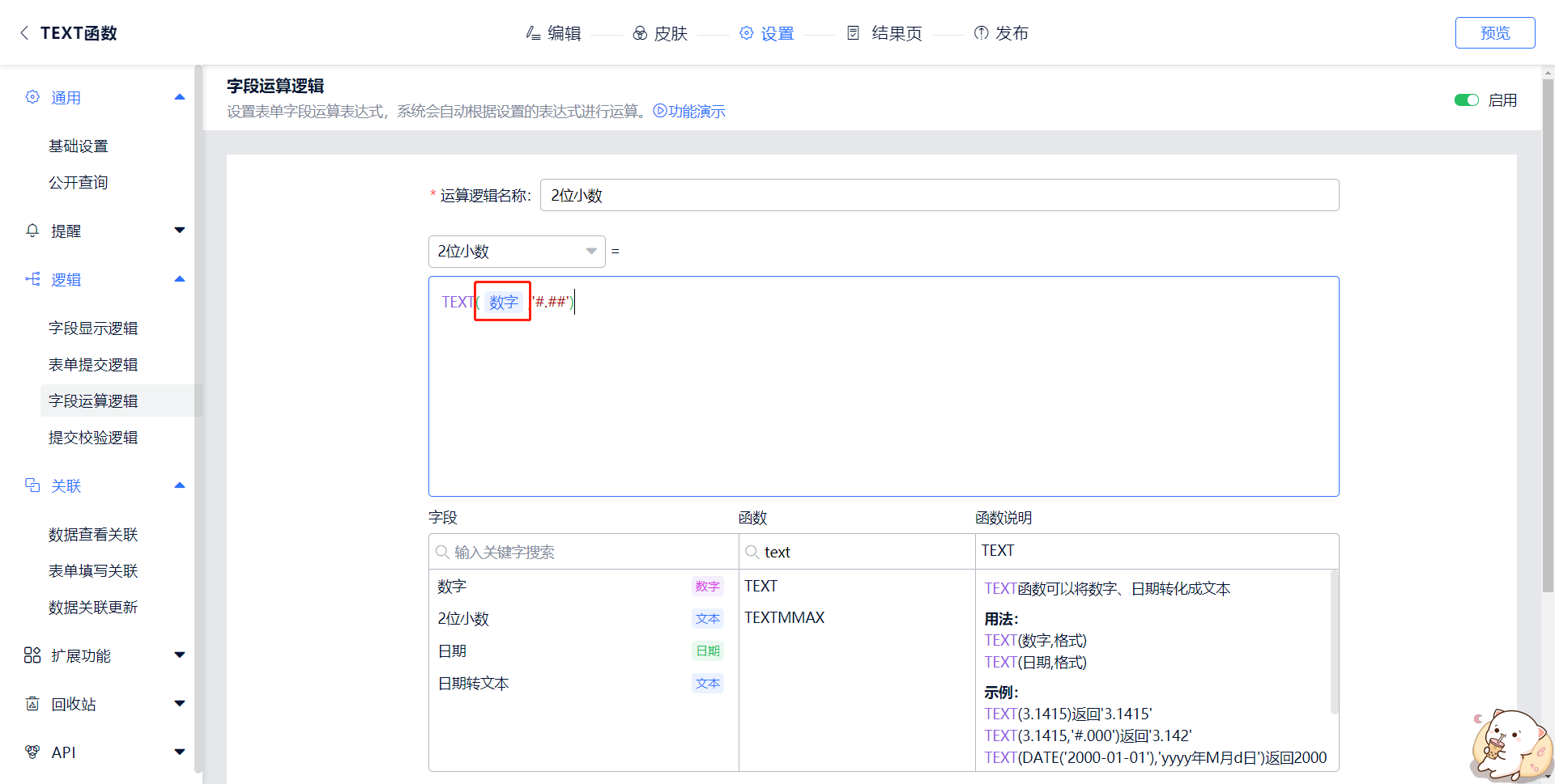 函数公式中的“数字”为表单中数字字段名,复制函数后需将该字段替换为表单内数字段,公式方可生效。