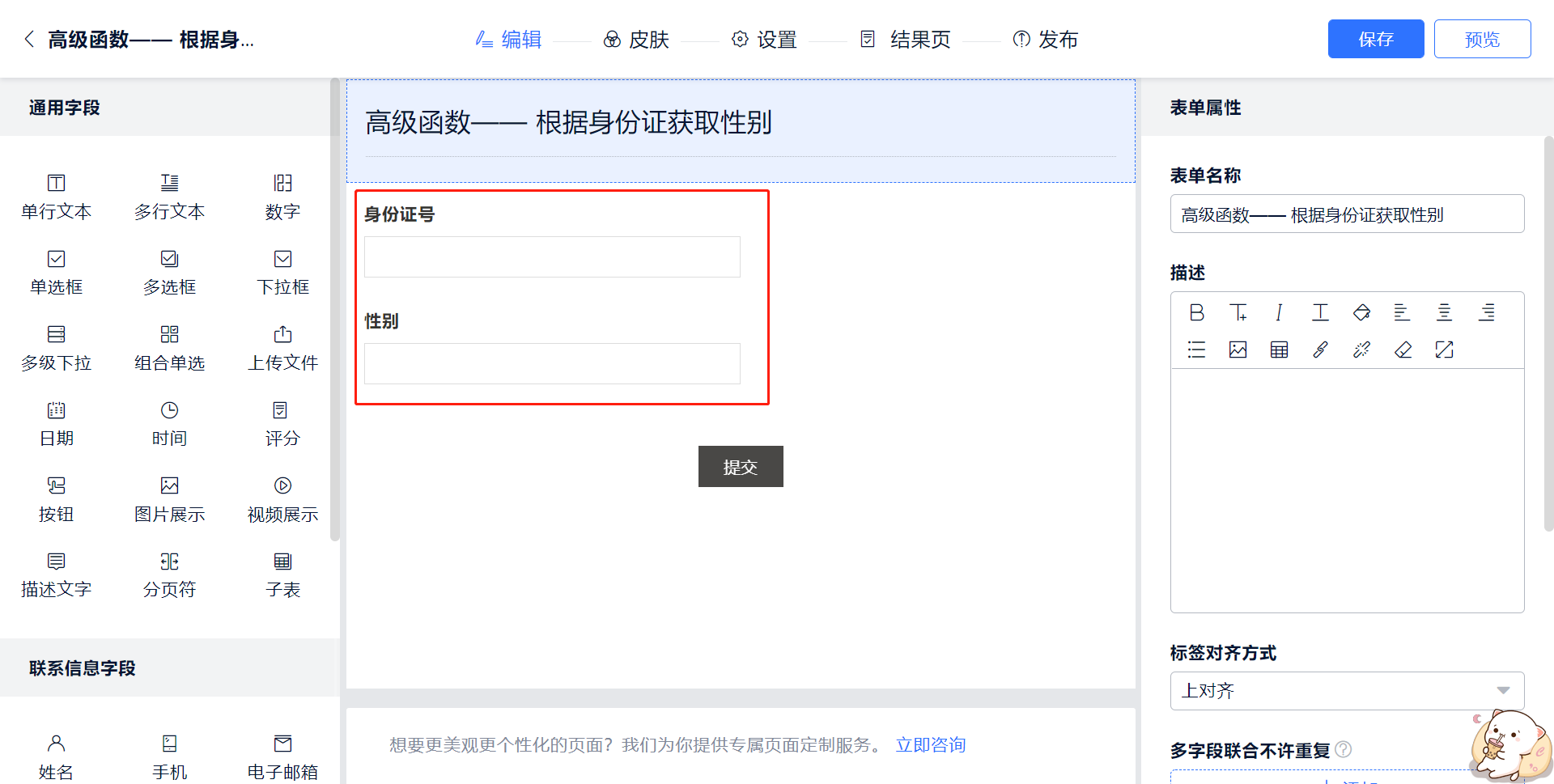 1.首先制作一张表单,添加两个文本字段,分别修改字段名称为:“身份证”和“性别”,在后面编辑高级函数公式时需要用到这两个字段。
