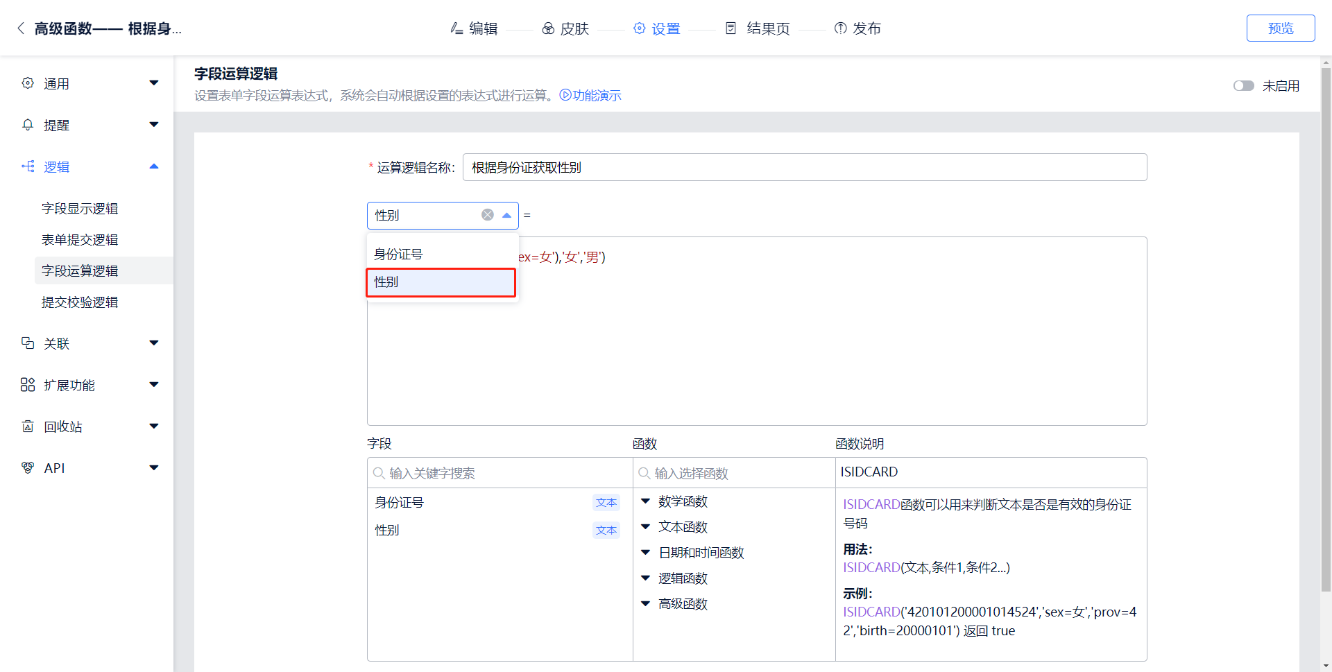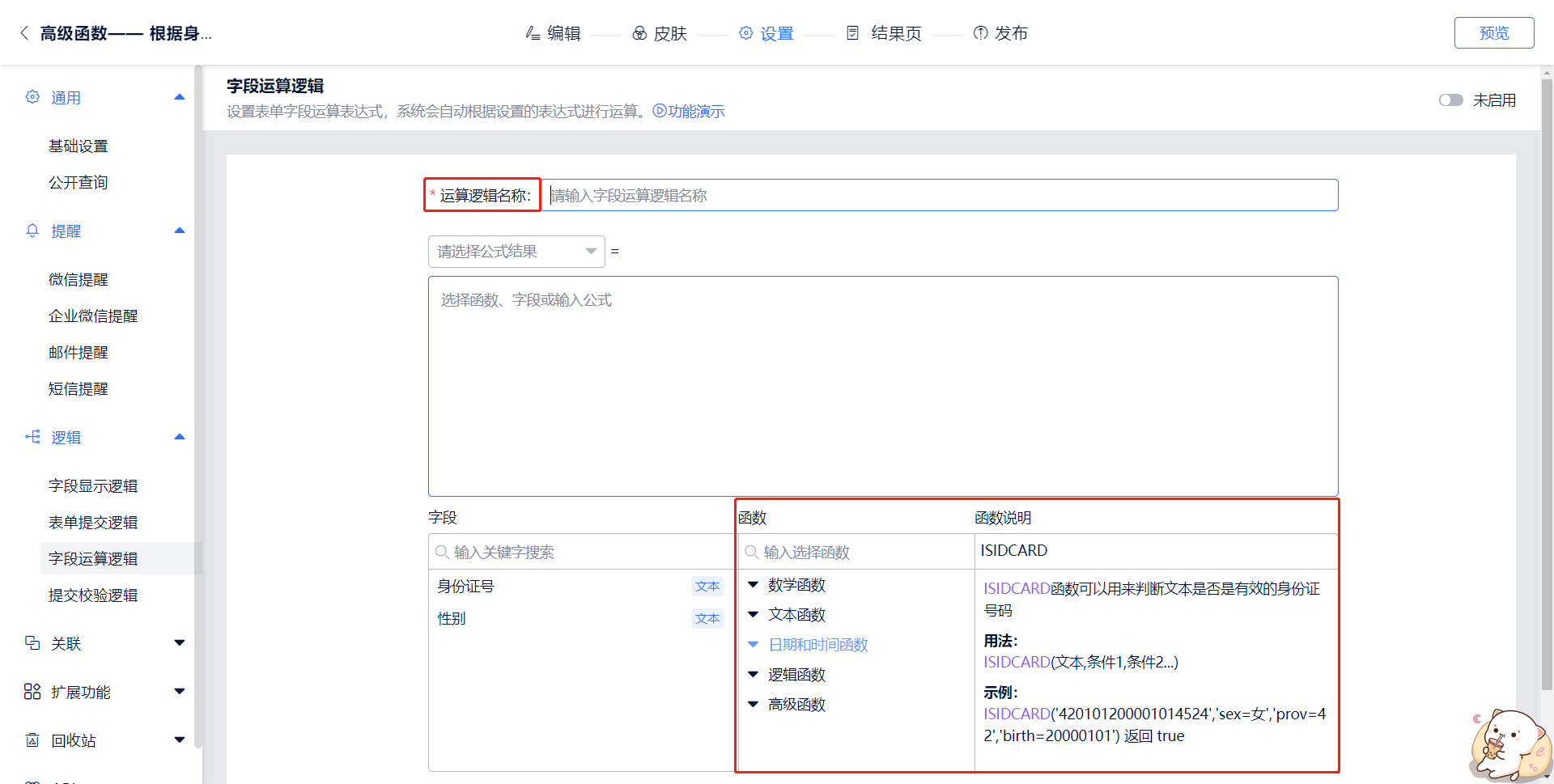 2.打开表单设置页面>>逻辑>>字段运算逻辑,添加一个字段运算逻辑,在页面最下方可以看到“函数”及“函数说明”,输入逻辑名称后就可以开始编辑函数公式了。