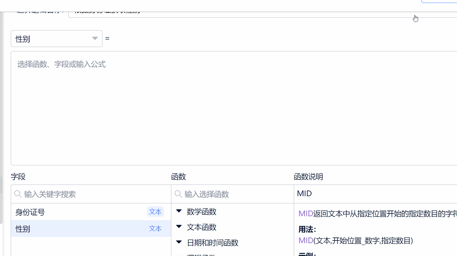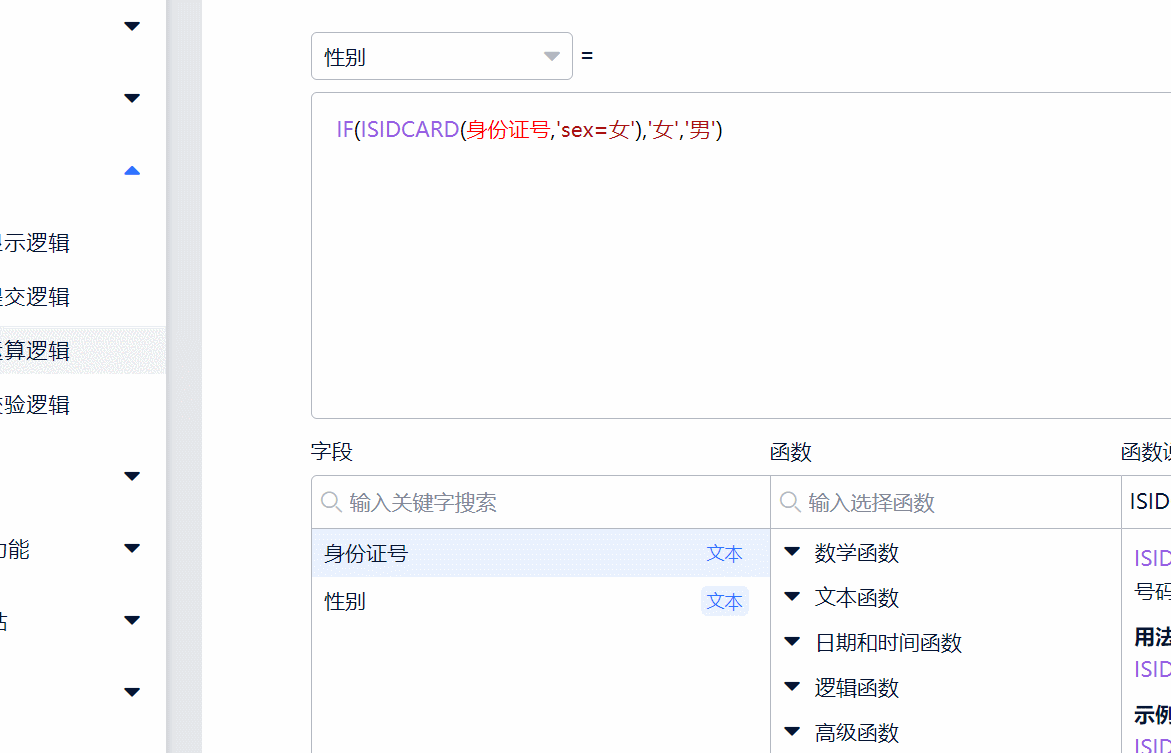 接下来步骤和上方一致,选择“公式结果”为“性别”字段,将上方的公式复制粘贴到输入框内,将公式中红色“身份证件号”文字删掉点击替换下方字段中的“身份证件号”文本,点击保存即可。