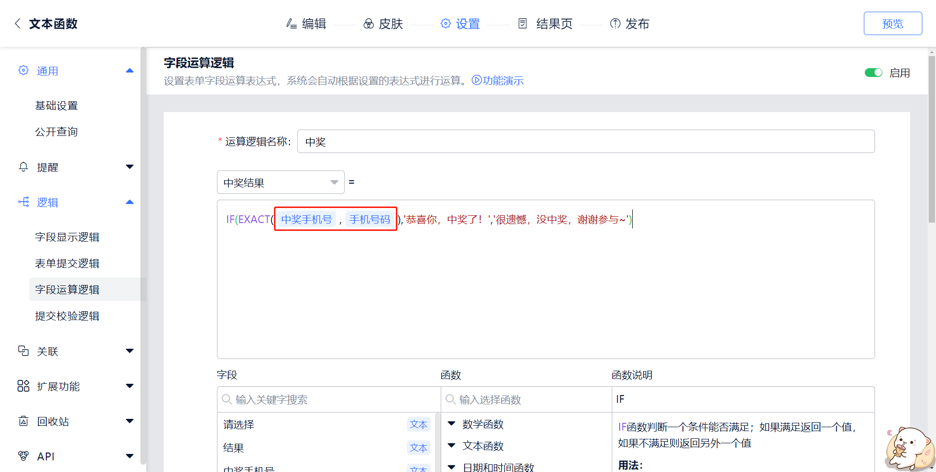 例如在利用表单进行营销时,经常会涉及到抽奖活动,通过表单的函数公式,固定中奖的手机号码,用户输入自己的手机号就可以查看是否中奖,并告知结果。