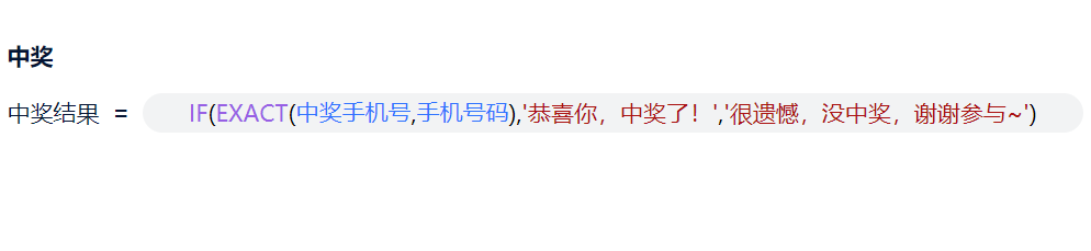 IF(EXACT(中奖手机号,手机号码),'恭喜你,中奖了!','很遗憾,没中奖,谢谢参与~')