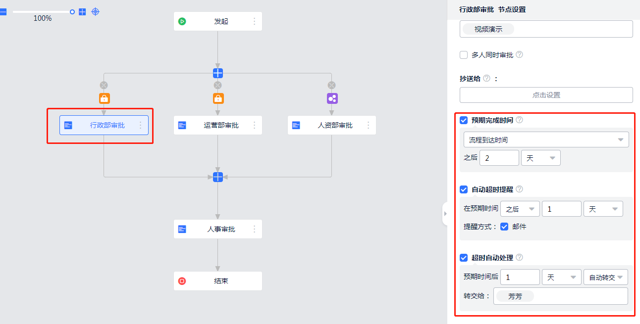 • 超时自动处理:可以选择在预期时间后的n天/小时/分钟 ,自动通过或自动转交给指定的其他负责人代为处理。