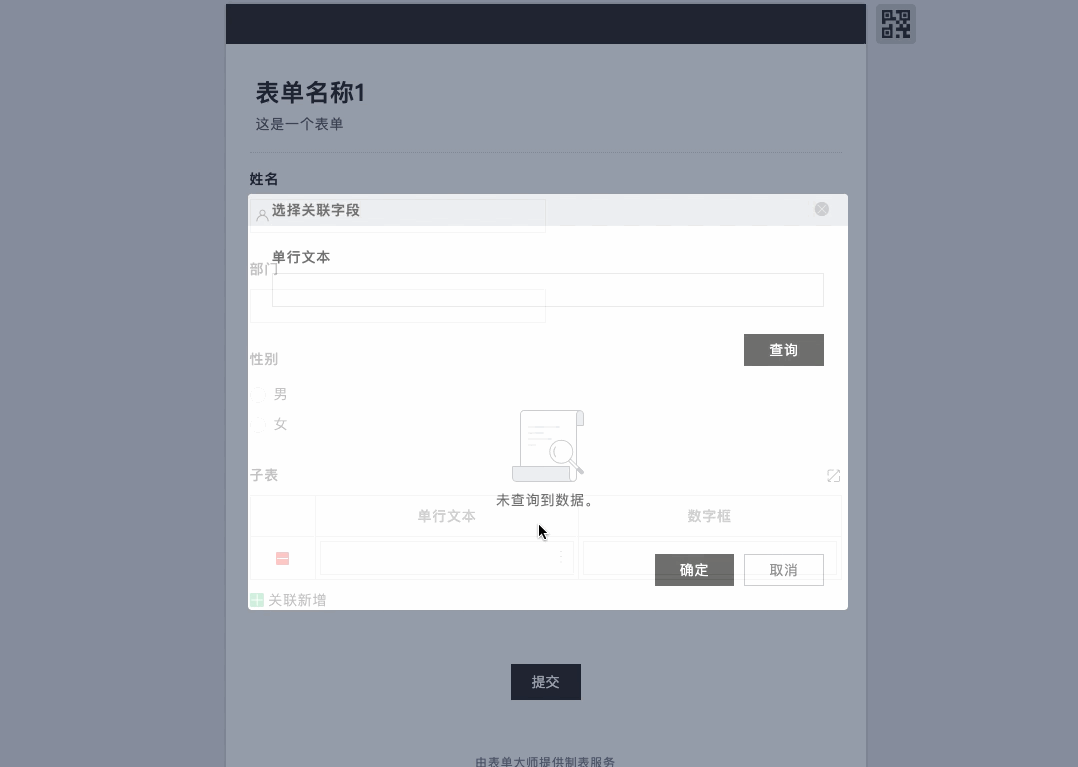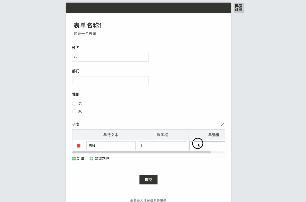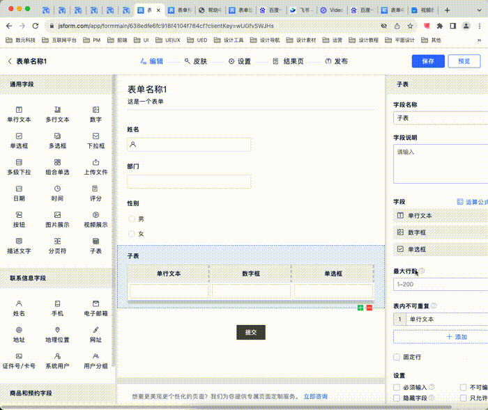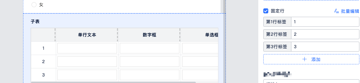 在表单编辑器中通过点击或拖动可以添加子表。一个表单最多添加X个子表。