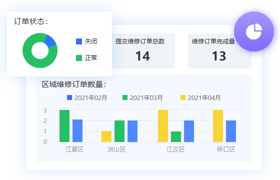 订单概况、维修网点分布、故障类别等图表式分析