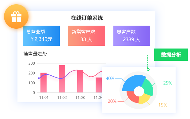 自定义搭建应用仪表盘,销售额、会员人数等核心指标集中展现;