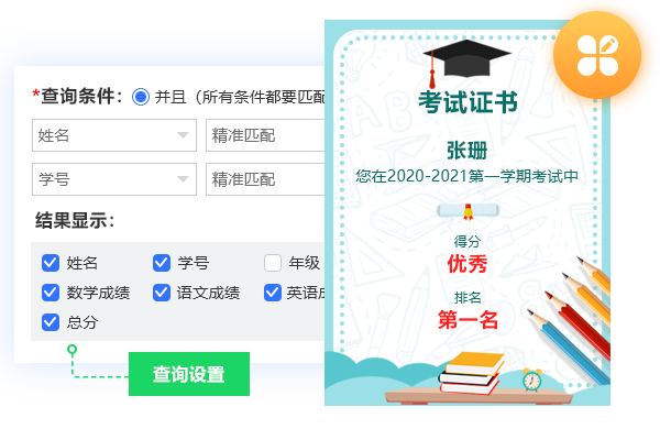 查询结果页支持自定义设计,生成成绩单、报告单、考试证书等样式